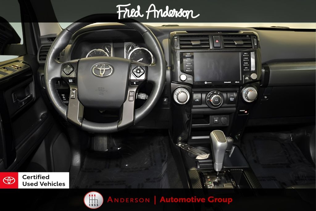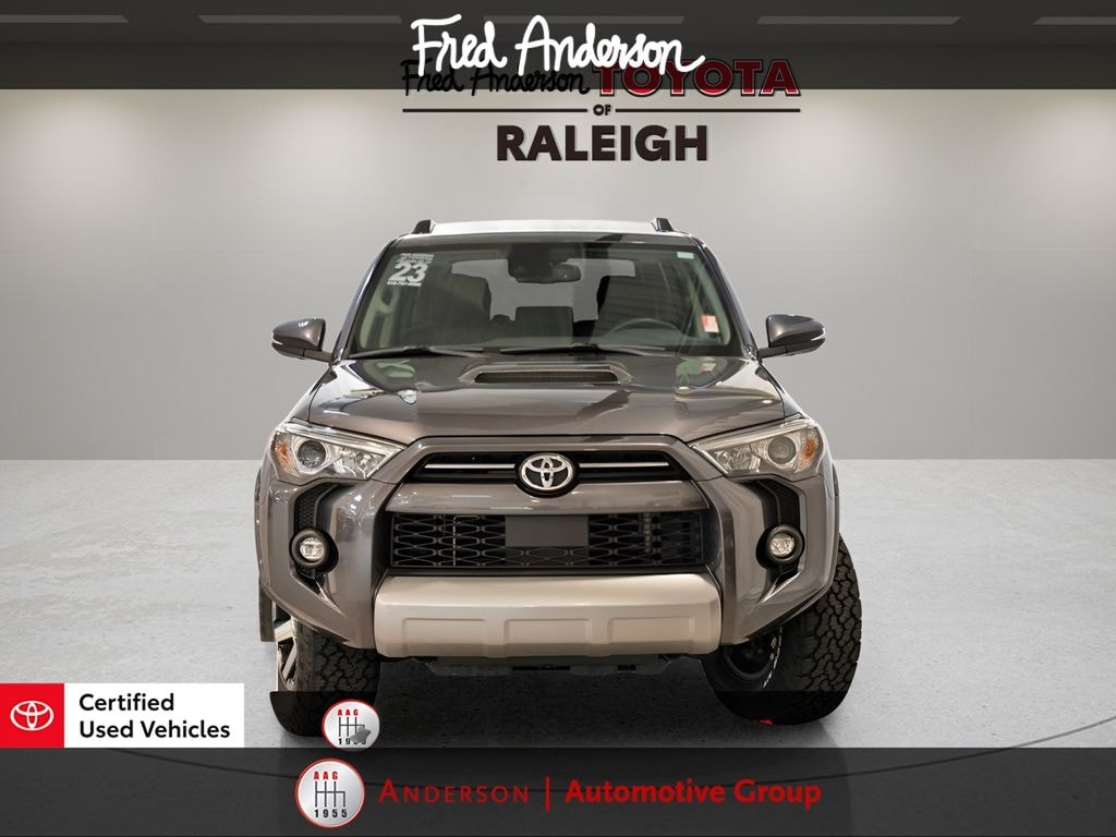 CARFAX One-Owner. Clean CARFAX. *Full Family Plan* INCLUDES OIL CHANGES FOR LIFE!, Still Under Factory Powertrain Warranty!!, Still Under Factory Warranty!!, Only One Owner and Accident Free Carfax!!, Navigation, Bought new here at Fred Anderson Toyota, Alloy wheels / Premium Wheels, Bluetooth, Hands-Free, Leather Seats, Local Trade, Star Safety System with Active Breaking Technologies, Keyless Entry, Keyless Start, Backup Camera, Sunroof / Panoramic Roof, Trailer Hitch, We will buy your car and pay top dollar for it, even if you don't buy ours!!, USB Port, 4WD, Black/Graphite w/Leather Seat Trim, Garage Door Opener, Moonroof Package, Moonroof w/Tilt Up & Slide, Navigation System, Off Road Premium Package. Odometer is 5404 miles below market average! Check out all these great options Moonroof Package (Moonroof w/Tilt Up & Slide), Off Road Premium Package (Garage Door Opener), Toyota Gold Certified Certified, 4WD, Black/Graphite w/Leather Seat Trim, Navigation System, 3.727 Axle Ratio, 4-Wheel Disc Brakes, 8 Speakers, ABS brakes, Air Conditioning, Alloy wheels, AM/FM radio: SiriusXM, Anti-whiplash front head restraints, Apple CarPlay/Android Auto, Auto High-beam Headlights, Auto-dimming Rear-View mirror, Black Roof Rails, Brake assist, Bumpers: body-color, Compass, Driver door bin, Driver vanity mirror, Dual front impact airbags, Dual front side impact airbags, Electronic Stability Control, Emergency communication system: Safety Connect (1-year trial), Exterior Parking Camera Rear, Front anti-roll bar, Front Bucket Seats, Front Center Armrest, Front fog lights, Front reading lights, Front wheel independent suspension, Garage door transmitter: HomeLink, Heated door mirrors, Heated Front Bucket Seats, Heated front seats, Heated Outside Rear-View Mirrors, Illuminated entry, Knee airbag, Leather Shift Knob, Low tire pressure warning, Occupant sensing airbag, Outside temperature display, Overhead airbag, Overhead console, Panic alarm, Passenger door bin, Passenger vanity mirror, Power door mirrors, Power driver seat, Power passenger seat, Power steering, Power windows, Radio: Premium Audio w/Dynamic Navigation, Rear anti-roll bar, Rear seat center armrest, Rear window defroster, Rear window wiper, Remote keyless entry, Roof rack: rails only, Security system, SofTex Seat Trim, Speed control, Speed-sensing steering, Split folding rear seat, Spoiler, Steering wheel mounted audio controls, Tachometer, Telescoping steering wheel, Tilt steering wheel, Traction control, Trip computer, Turn signal indicator mirrors, Variably intermittent wipers, and Wheels: 17" Unique 7-Spoke Off-Road AlloyStop by and test drive today. Let us show you how affordable we can make it. Remember, we always give you more for your trade and we will buy your vehicle even if you don't buy one from us. See online @ www.FredAndersonToyota.com or see in person @ Fred Anderson Toyota 9101 Glenwood Ave. Raleigh NC, 27617. 2023 Toyota Certified. 4Runner TRD Off-Road Premium 4WD Magnetic Gray 5-Speed with ECT