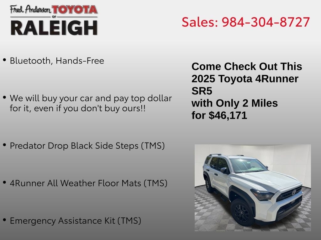 Check out all these great options 4WD, Black Fabric Cloth, 4Runner All Weather Floor Mats (TMS), Emergency Assistance Kit (TMS), Predator Drop Black Side Steps (TMS), 4-Wheel Disc Brakes, 8 Speakers, ABS brakes, Air Conditioning, Alloy wheels, AM/FM radio: SiriusXM, Anti-whiplash front head restraints, Apple CarPlay/Android Auto, Auto High-beam Headlights, Automatic temperature control, Brake assist, Bumpers: body-color, Driver door bin, Driver vanity mirror, Dual front impact airbags, Dual front side impact airbags, Electronic Stability Control, Emergency communication system: Safety Connect (1-year trial), Exterior Parking Camera Rear, Fabric Seat Trim (FA), Front anti-roll bar, Front Bucket Seats, Front Center Armrest, Front dual zone A/C, Front fog lights, Front reading lights, Front wheel independent suspension, Heated door mirrors, Illuminated entry, Knee airbag, Leather Shift Knob, Leather steering wheel, Low tire pressure warning, Occupant sensing airbag, Outside temperature display, Overhead airbag, Overhead console, Panic alarm, Passenger door bin, Passenger vanity mirror, Power door mirrors, Power steering, Power windows, Radio: 8" Audio, Rear anti-roll bar, Rear seat center armrest, Rear side impact airbag, Rear window defroster, Rear window wiper, Remote keyless entry, Security system, Speed control, Speed-sensing steering, Split folding rear seat, Spoiler, Steering wheel mounted audio controls, Tachometer, Telescoping steering wheel, Tilt steering wheel, Traction control, Trip computer, Variably intermittent wipers, and Wheels: 17" Dark-Gray Painted AlloyStop by and test drive today. Let us show you how affordable we can make it. Remember, we always give you more for your trade and we will buy your vehicle even if you don't buy one from us. See online @ www.FredAndersonToyota.com or see in person @ Fred Anderson Toyota 9101 Glenwood Ave. Raleigh NC, 27617. Bluetooth, Hands-Free, We will buy your car and pay top dollar for it, even if you don't buy ours!!, 4WD, Black Fabric Cloth, 4Runner All Weather Floor Mats (TMS), Emergency Assistance Kit (TMS), Predator Drop Black Side Steps (TMS).