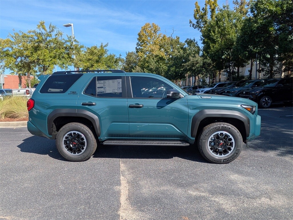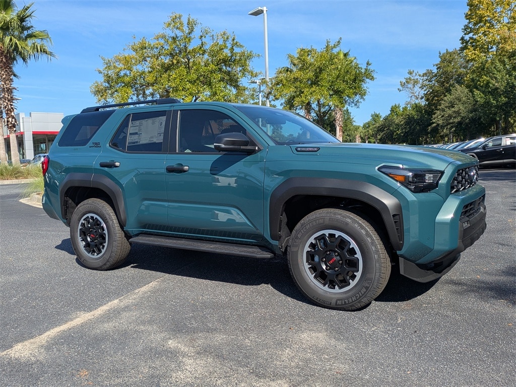 - Black honeycomb-style grille, mirror caps, door handles, and overfenders color-keyed rear spoiler black 'TRD OFF ROAD' and '4RUNNER' badges