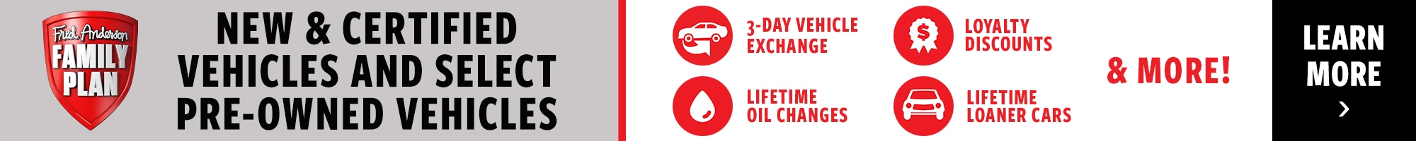 Fred Anderson Family Plan Raleigh NC All new vehicle purchases from Fred Anderson Toyota will come with lifetime oil changes, loaner cars, car washes, and special loyalty discounts. See Dealer or fredandersontoyota.com For Details. Subject to change.