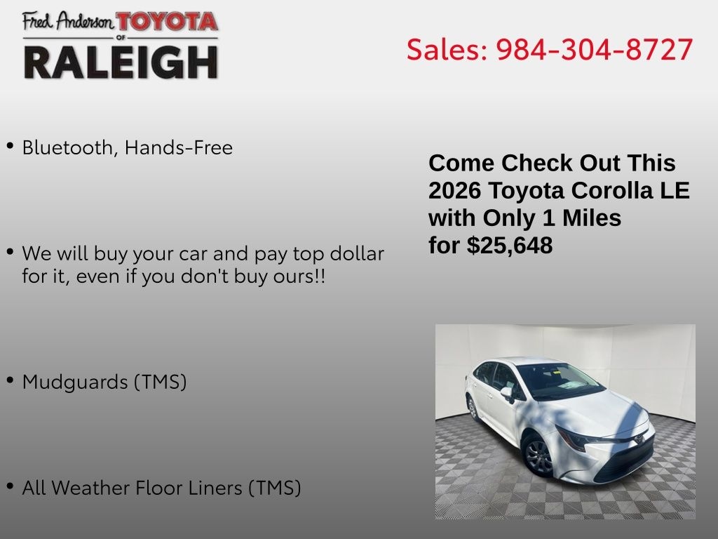 Check out all these great options Mudguards (TMS), 16" Steel Wheels w/Covers, 4-Wheel Disc Brakes, 6 Speakers, ABS brakes, Air Conditioning, AM/FM radio: SiriusXM, Apple CarPlay/Android Auto, Auto High-beam Headlights, Automatic temperature control, Brake assist, Bumpers: body-color, Delay-off headlights, Driver door bin, Driver vanity mirror, Dual front impact airbags, Dual front side impact airbags, Electronic Stability Control, Emergency communication system: Safety Connect (up to 10-year trial subscription), Exterior Parking Camera Rear, Fabric Seat Trim, Front anti-roll bar, Front Bucket Seats, Front Center Armrest, Front reading lights, Front wheel independent suspension, Fully automatic headlights, Heated door mirrors, Illuminated entry, Knee airbag, Low tire pressure warning, Occupant sensing airbag, Outside temperature display, Overhead airbag, Panic alarm, Passenger door bin, Passenger vanity mirror, Power door mirrors, Power steering, Power windows, Radio data system, Radio: 8" Toyota Audio Multimedia, Rear anti-roll bar, Rear seat center armrest, Rear side impact airbag, Rear window defroster, Remote keyless entry, Speed control, Split folding rear seat, Steering wheel mounted audio controls, Tachometer, Telescoping steering wheel, Tilt steering wheel, Traction control, and Trip computerStop by and test drive today. Let us show you how affordable we can make it. Remember, we always give you more for your trade and we will buy your vehicle even if you don't buy one from us. See online @ www.FredAndersonToyota.com or see in person @ Fred Anderson Toyota 9101 Glenwood Ave. Raleigh NC, 27617. Bluetooth, Hands-Free, We will buy your car and pay top dollar for it, even if you don't buy ours!!, Mudguards (TMS).