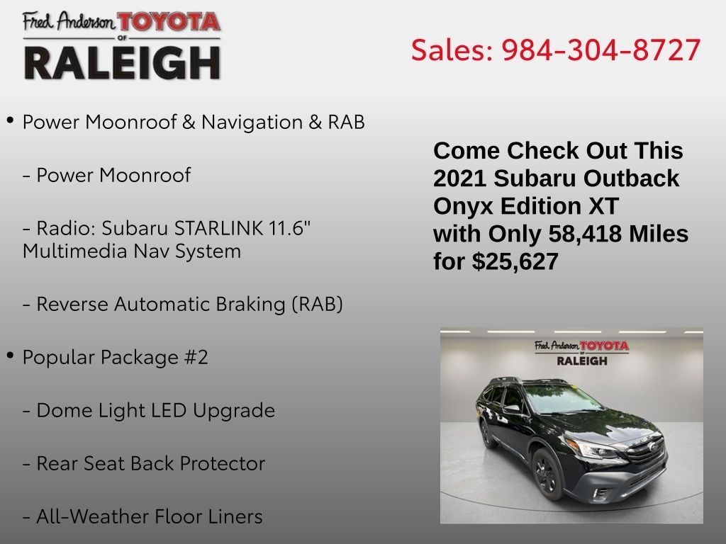 Clean CARFAX. Still Under Factory Powertrain Warranty!!, Accident Free Carfax!!, Navigation, Alloy wheels / Premium Wheels, Bluetooth, Hands-Free, Leather Seats, Local Trade, Star Safety System with Active Breaking Technologies, Keyless Entry, Keyless Start, Backup Camera, Sunroof / Panoramic Roof, We will buy your car and pay top dollar for it, even if you don't buy ours!!, USB Port, All-Weather Floor Liners, Auto-Dimming Exterior Mirror w/Approach Light, Dome Light LED Upgrade, Popular Package #2, Power Moonroof, Power Moonroof & Navigation & RAB, Radio: Subaru STARLINK 11.6" Multimedia Nav System, Rear Bumper Cover, Rear Seat Back Protector, Reverse Automatic Braking (RAB), Splash Guards. Check out all these great options Popular Package #2 (All-Weather Floor Liners, Auto-Dimming Exterior Mirror w/Approach Light, Dome Light LED Upgrade, Rear Bumper Cover, Rear Seat Back Protector, and Splash Guards), Power Moonroof & Navigation & RAB (Power Moonroof, Radio: Subaru STARLINK 11.6" Multimedia Nav System, and Reverse Automatic Braking (RAB)), 4-Wheel Disc Brakes, 4.111 Axle Ratio, 6 Speakers, ABS brakes, Air Conditioning, Alloy wheels, AM/FM radio: SiriusXM, Auto High-beam Headlights, Auto-dimming Rear-View mirror, Automatic temperature control, Brake assist, Bumpers: body-color, Compass, Driver door bin, Driver vanity mirror, Dual front impact airbags, Dual front side impact airbags, Electronic Stability Control, Emergency communication system: STARLINK Safety and Security (Subscription Required), Exterior Parking Camera Rear, Four wheel independent suspension, Front anti-roll bar, Front Bucket Seats, Front Center Armrest w/Storage, Front dual zone A/C, Front fog lights, Front reading lights, Fully automatic headlights, Garage door transmitter: HomeLink, Heated door mirrors, Heated Front Bucket Seats, Heated front seats, Heated rear seats, Illuminated entry, Knee airbag, Leather steering wheel, Low tire pressure warning, Occupant sensing airbag, Outside temperature display, Overhead airbag, Overhead console, Panic alarm, Passenger door bin, Passenger vanity mirror, Power door mirrors, Power driver seat, Power Liftgate, Power passenger seat, Power steering, Power windows, Radio: Subaru STARLINK 11.6" Multimedia Plus Sys, Rear anti-roll bar, Rear seat center armrest, Rear window defroster, Rear window wiper, Remote keyless entry, Roof rack, Security system, Speed control, Speed-sensing steering, Split folding rear seat, Spoiler, STARLINK/Apple CarPlay/Android Auto, StarTex-Trimmed Upholstery, Steering wheel mounted audio controls, Steering Wheel Paddle Shift Control Switches, Tachometer, Telescoping steering wheel, Tilt steering wheel, Traction control, Trip computer, Turn signal indicator mirrors, Variably intermittent wipers, Wheels: 18" x 7J Black Aluminum Alloy, and Windshield SunshadeStop by and test drive today. Let us show you how affordable we can make it. Remember, we always give you more for your trade and we will buy your vehicle even if you don't buy one from us. See online @ www.FredAndersonToyota.com or see in person @ Fred Anderson Toyota 9101 Glenwood Ave. Raleigh NC, 27617. 2021 Subaru Outback Onyx Edition XT AWD Crystal Black Silica CVT Lineartronic