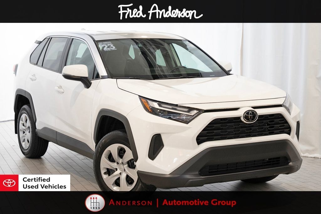 CARFAX One-Owner. Clean CARFAX. Priced below KBB Fair Purchase Price! *Full Family Plan* INCLUDES OIL CHANGES FOR LIFE!, Still Under Factory Powertrain Warranty!!, Still Under Factory Warranty!!, Only One Owner and Accident Free Carfax!!, Bought new here at Fred Anderson Toyota, Bluetooth, Hands-Free, Local Trade, Star Safety System with Active Breaking Technologies, Keyless Entry, Backup Camera, We will buy your car and pay top dollar for it, even if you don't buy ours!!, USB Port, Black w/Fabric Seat Trim. Odometer is 31371 miles below market average! Check out all these great options Toyota Gold Certified Certified, Black w/Fabric Seat Trim, 17" Steel Wheels, 4-Wheel Disc Brakes, 6 Speakers, ABS brakes, Air Conditioning, AM/FM radio: SiriusXM, Auto High-beam Headlights, Axle Ratio: 3.177, Brake assist, Bumpers: body-color, Driver door bin, Driver vanity mirror, Dual front impact airbags, Dual front side impact airbags, Electronic Stability Control, Emergency communication system: Safety Connect (10-year trial), Exterior Parking Camera Rear, Fabric Seat Trim, Four wheel independent suspension, Front anti-roll bar, Front Bucket Seats, Front Center Armrest, Front reading lights, Illuminated entry, Knee airbag, Low tire pressure warning, Occupant sensing airbag, Outside temperature display, Overhead airbag, Overhead console, Panic alarm, Passenger door bin, Passenger vanity mirror, Power door mirrors, Power steering, Power windows, Radio data system, Radio: AM/FM/XM Audio System, Rear anti-roll bar, Rear seat center armrest, Rear window defroster, Rear window wiper, Remote keyless entry, Speed control, Speed-sensing steering, Split folding rear seat, Spoiler, Steering wheel mounted audio controls, Tachometer, Telescoping steering wheel, Tilt steering wheel, Traction control, and Trip computerStop by and test drive today. Let us show you how affordable we can make it. Remember, we always give you more for your trade and we will buy your vehicle even if you don't buy one from us. See online @ www.FredAndersonToyota.com or see in person @ Fred Anderson Toyota 9101 Glenwood Ave. Raleigh NC, 27617. 2023 Toyota Certified. RAV4 LE FWD Ice Cap 8-Speed Automatic